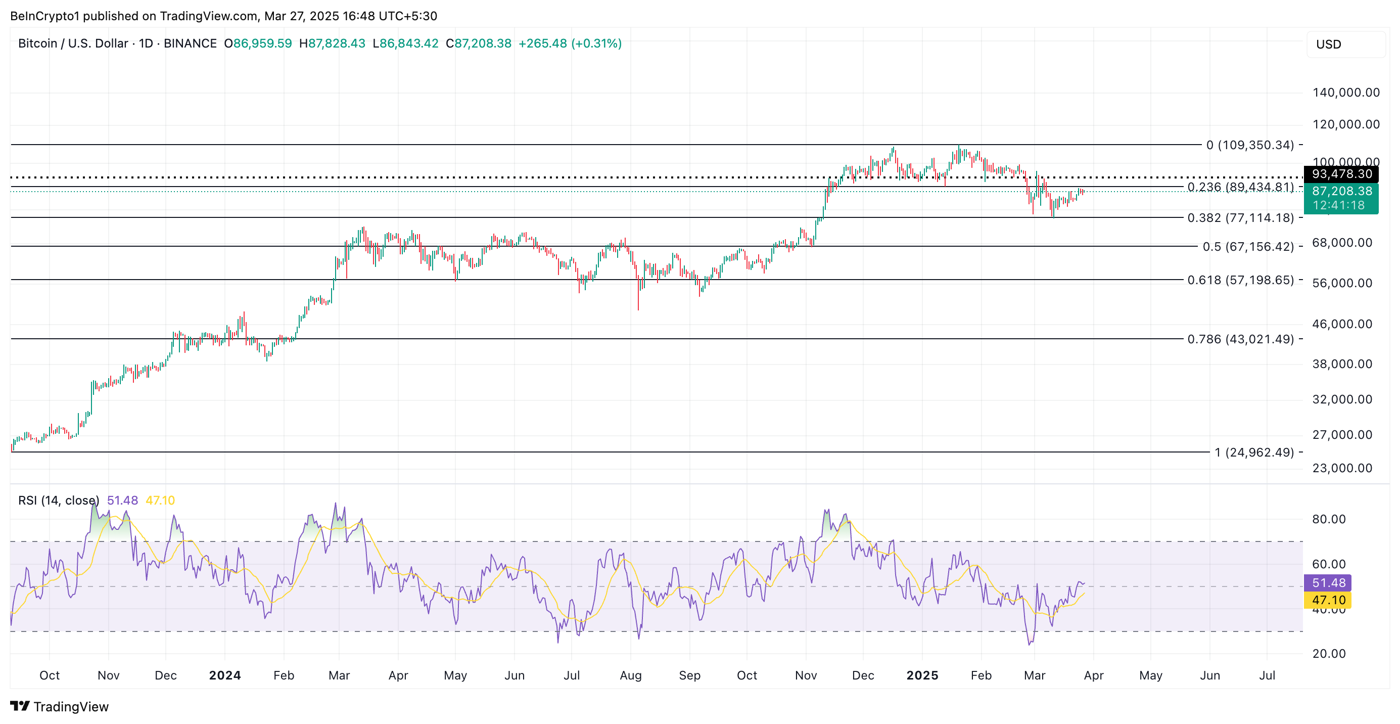 يتداول BTC عند 87,208 دولار في وقت النشر، مرتفعًا بنسبة 2% في الأسبوع الماضي. على مخطط BTC/USD اليومي، يقف مؤشر القوة النسبية (RSI) للعملة قليلاً فوق الخط المحايد عند 51,48، مما يشير إلى الانتعاش التدريجي في الطلب الجديد على العملة الملكية.