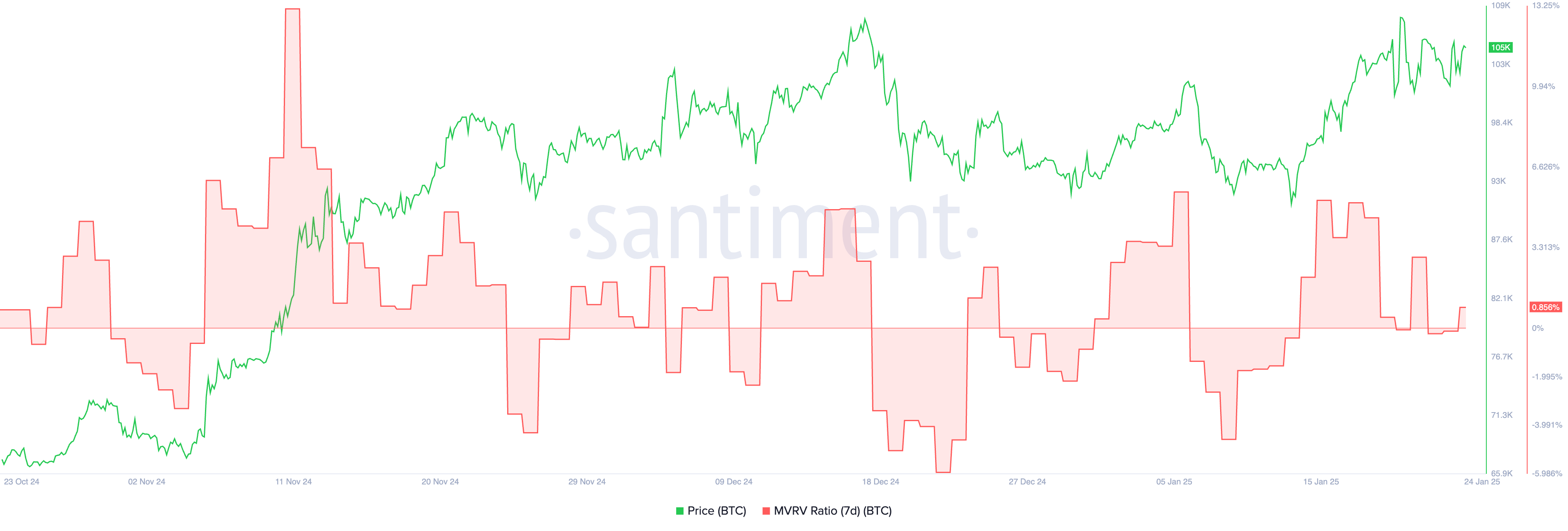 نسبة MVRV (القيمة السوقية إلى القيمة المحققة) لمدة 7 أيام لـ بيتكوين تقف حاليًا عند 0,85%، بعد فترة من الاستقرار بالقرب من 0% خلال اليومين الماضيين. يقيس هذا المقياس متوسط الربح أو الخسارة لحاملي BTC الذين حصلوا على عملاتهم في الأيام السبعة الماضية.