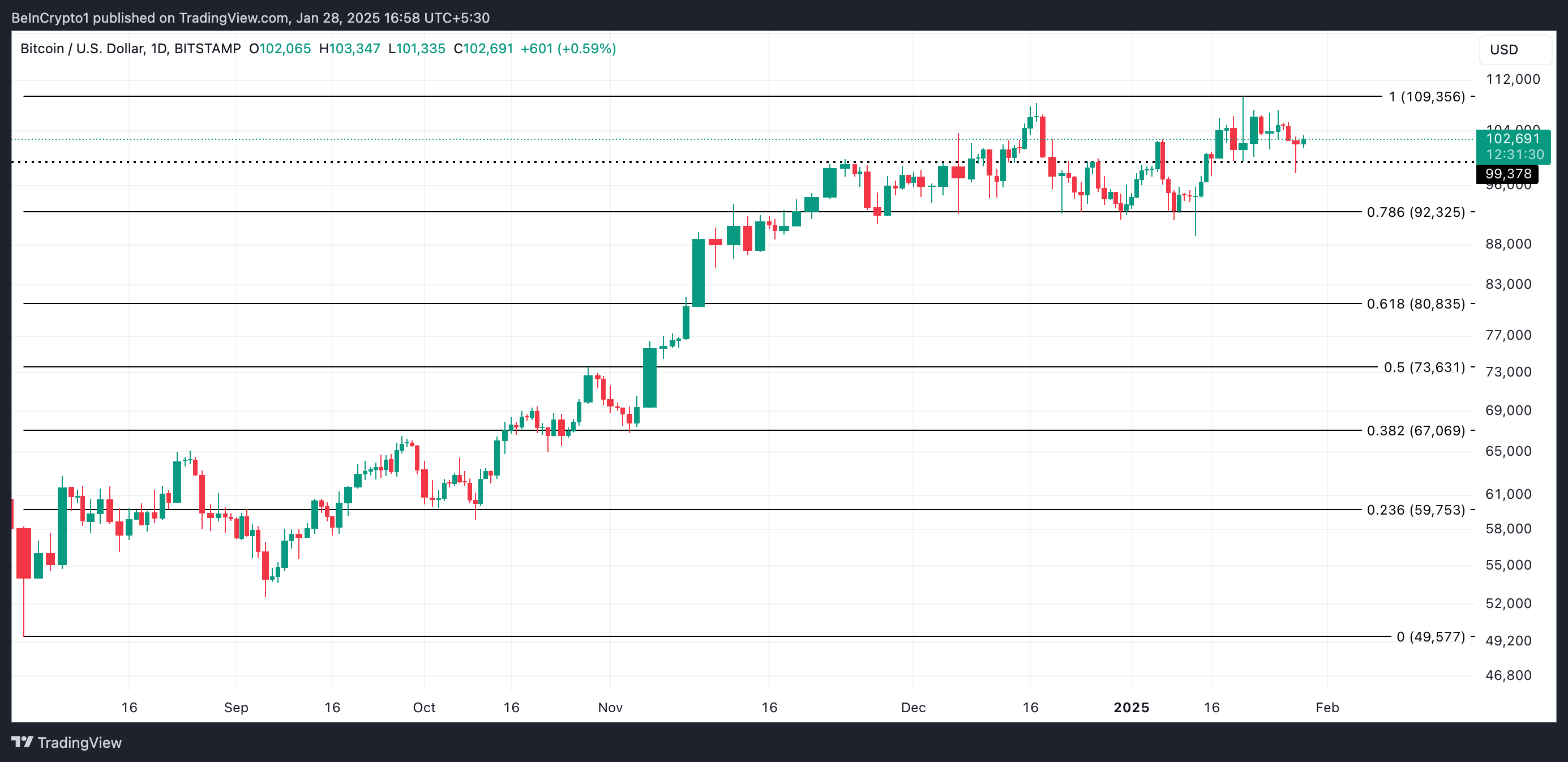 سوف يفقد سعر BTC مكاسبه الأخيرة إذا تعزز هذا الانحياز السلبي وتراجعت زخم التداول. قد ينخفض إلى أقل من ١٠٠٬٠٠٠$ ليتداول عند ٩٩٬٣٧٨$ في هذه الحالة.