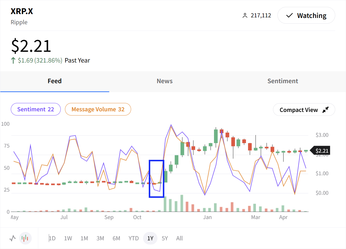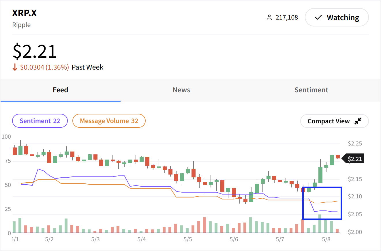 بيانات المشاعر الاجتماعية من Stocktwits هي أداة قوية أخرى عند محاولة شراء XRP في القاع. تلتقط Stocktwits رؤى حصريًا من المتداولين والمستثمرين - لا يوجد حديث عشوائي من وسائل التواصل الاجتماعي العامة.