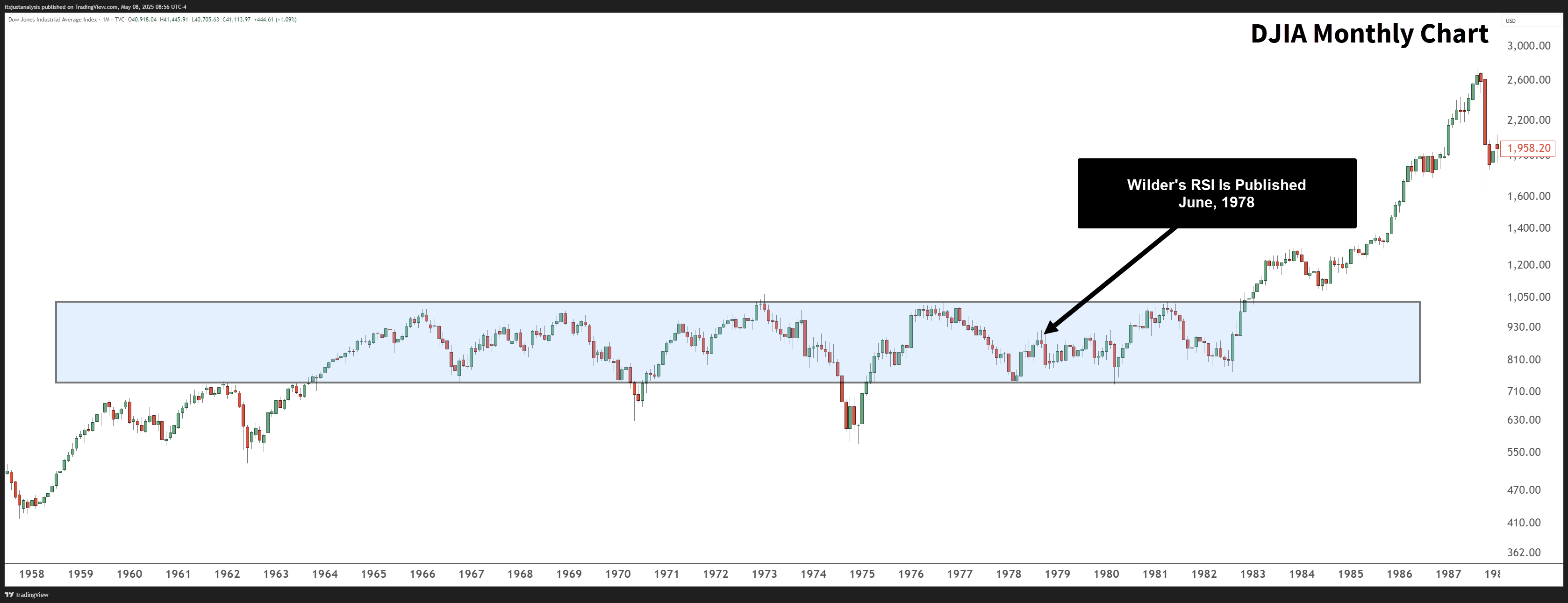 في عام ١٩٧٨، قدم J. Welles Wilder مؤشر RSI. في ذلك الوقت، كان ثوريًا. لماذا؟ لأن RSI يزدهر في الأسواق المتراوحة، وهو بالضبط ما واجهه المستثمرون خلال زمن وايلدر: