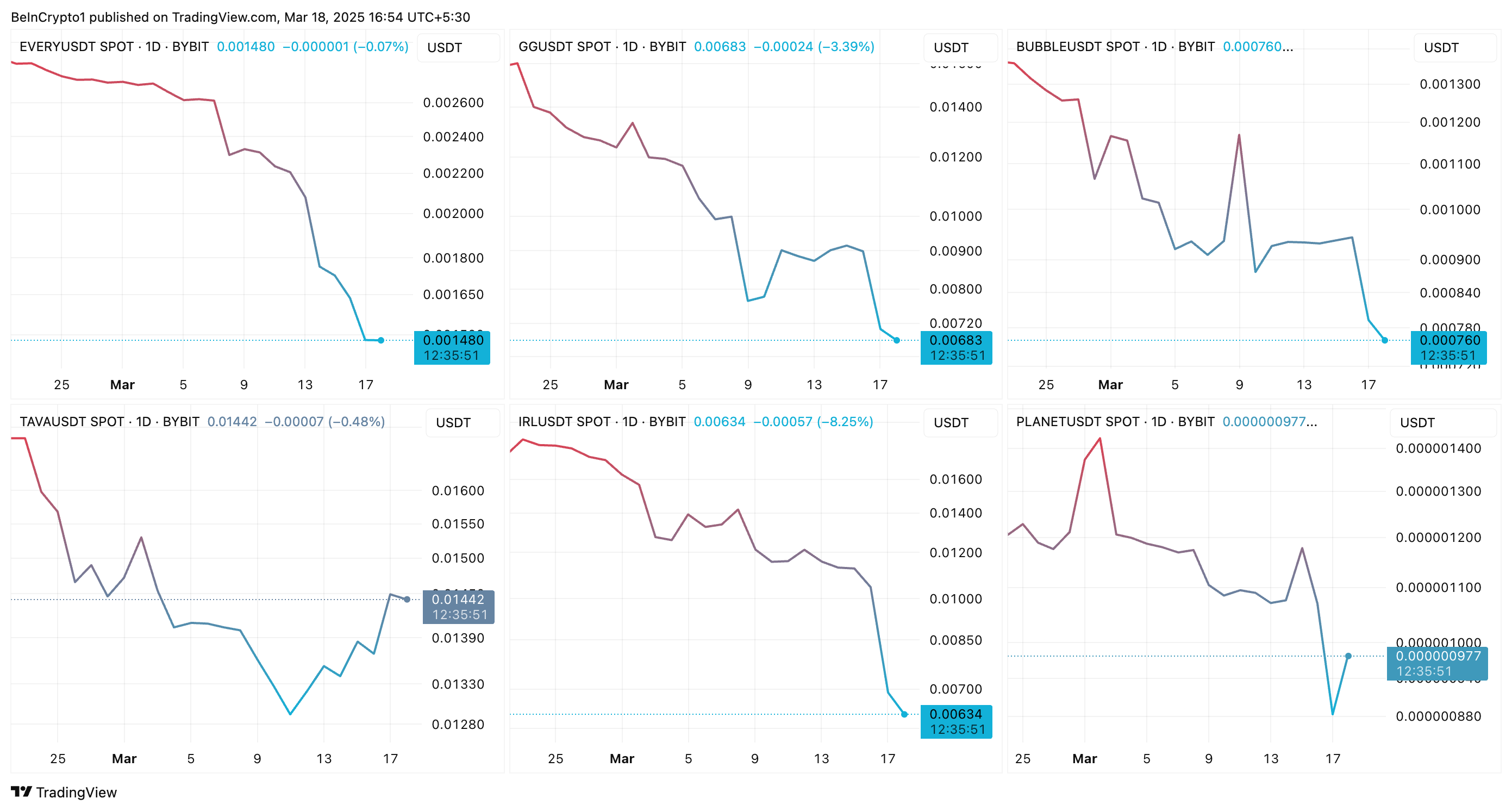 علاوة على ذلك، إيفري وورلد (EVERY) انخفض بنسبة 8,3%، بينما إيماجيناري وانز (BUBBLE) شهد انخفاضًا بنسبة 15,5%، مما يعكس قلق المستثمرين. بلانيت توكن (PLANET) انخفض بنسبة 11,8%، مما يضيف إلى الاتجاه. ومع ذلك، ألتافا (TAVA) كان استثناءً، حيث أظهر زيادة بنسبة 3,7%، مما يشير إلى بعض المقاومة على الرغم من الاتجاه الهبوطي الأوسع.