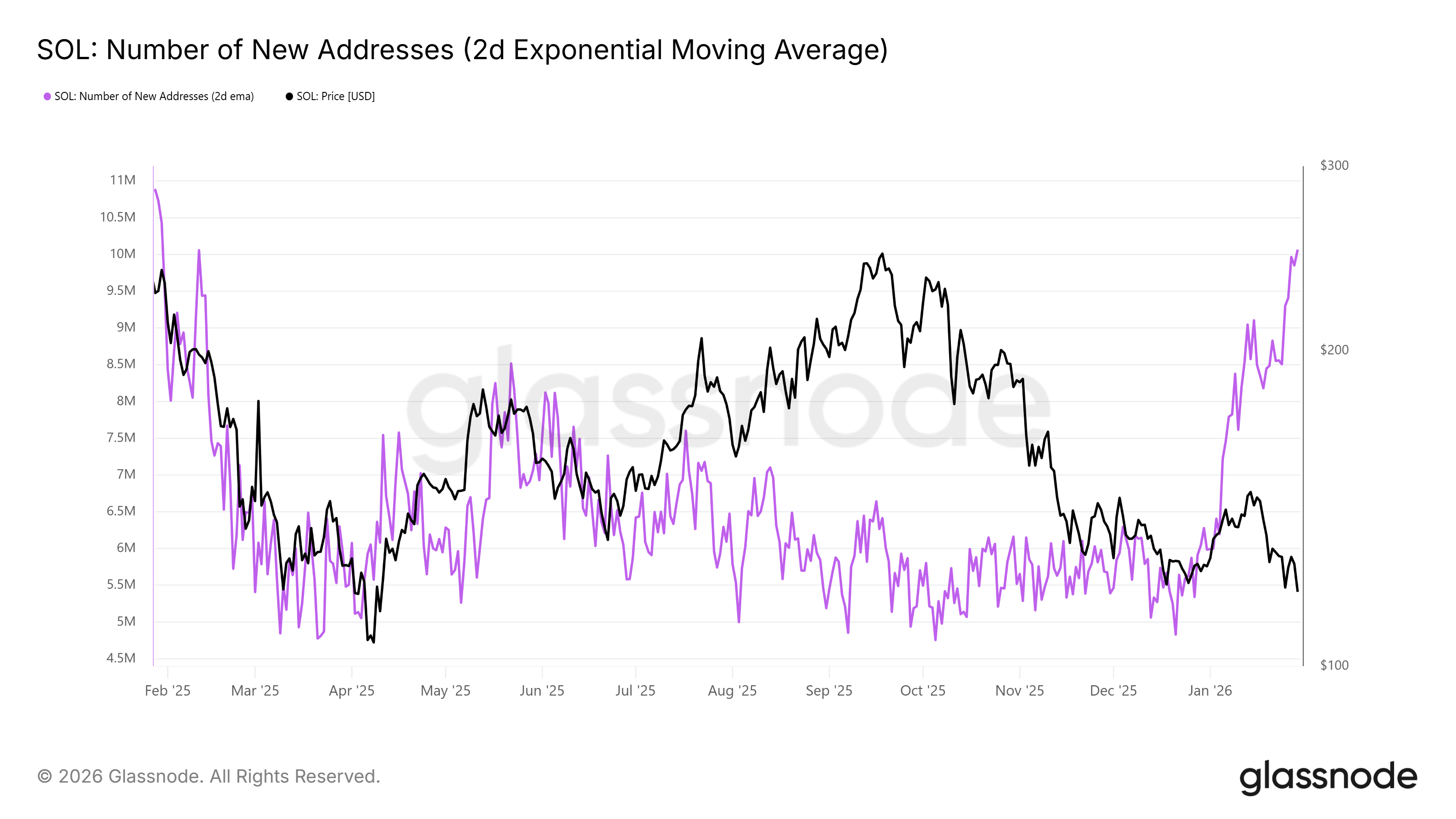 تشير بيانات النشاط على الشبكة إلى زيادة ملحوظة في المشاركة. أصبح سولانا الآن يضيف تقريباً 10,2 مليون عنوان جديد يومياً. تُمثّل هذه العناوين محافظ أكملت معاملة للمرة الأولى. غالباً ما تشير مثل هذه الزيادة إلى توسع التبني ودخول رؤوس أموال جديدة للنظام البيئي.