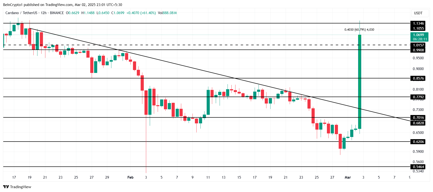 في وقت كتابة هذا التقرير، ارتفع سعر كاردانو بنسبة 60%، ويتداول عند $1,06. يمثل هذا تعافيًا كبيرًا بعد أن كافح العملة البديلة تحت علامة $1 لمدة ستة أسابيع. الزيادة في السعر هي نتيجة مباشرة لرد فعل السوق على إعلان ترامب، مع دفع قوي من ADA فوق $1. هذا المستوى حاسم لأنه يمثل عتبة نفسية لكل من المتداولين والمستثمرين.