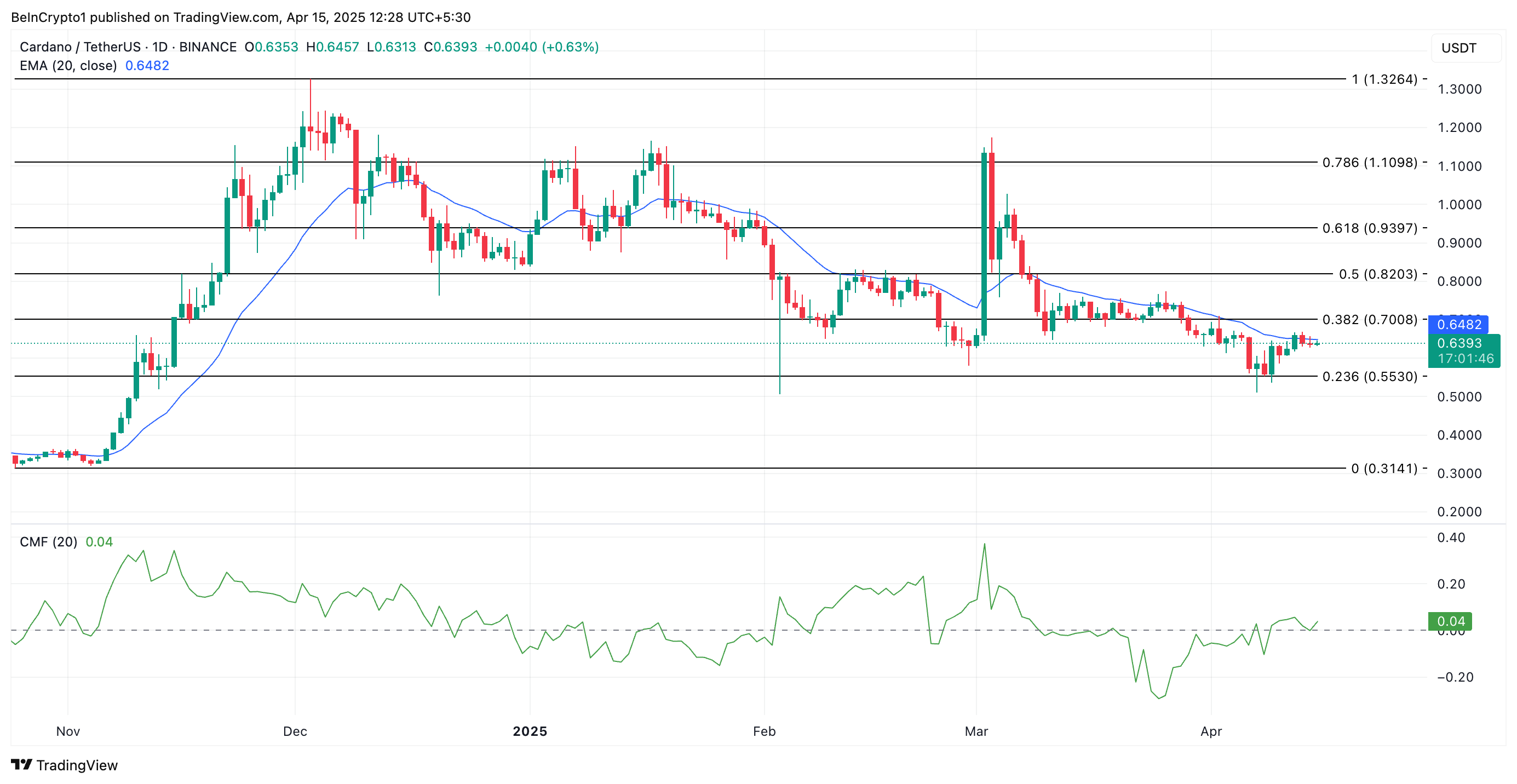 على الرسم البياني اليومي لـ ADA/USD، يعزز تدفق المال الإيجابي لـ Chaikin (CMF) هذه النظرة الصعودية. في وقت النشر، هذا المؤشر، الذي يقيس كيفية تدفق الأموال إلى داخل وخارج الأصل، عند 0,04.