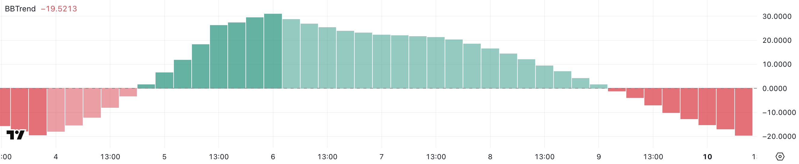 BBTrend، أو اتجاه بولينجر باند، هو مؤشر يقيس اتجاهات الأسعار بناءً على نطاقات بولينجر. يظهر ما إذا كان الأصل في مرحلة صعودية قوية أو هبوطية. عندما يكون BBTrend إيجابيًا، فإنه يشير إلى زخم صعودي قوي، بينما تشير القيم السلبية إلى زيادة ضغط البيع.