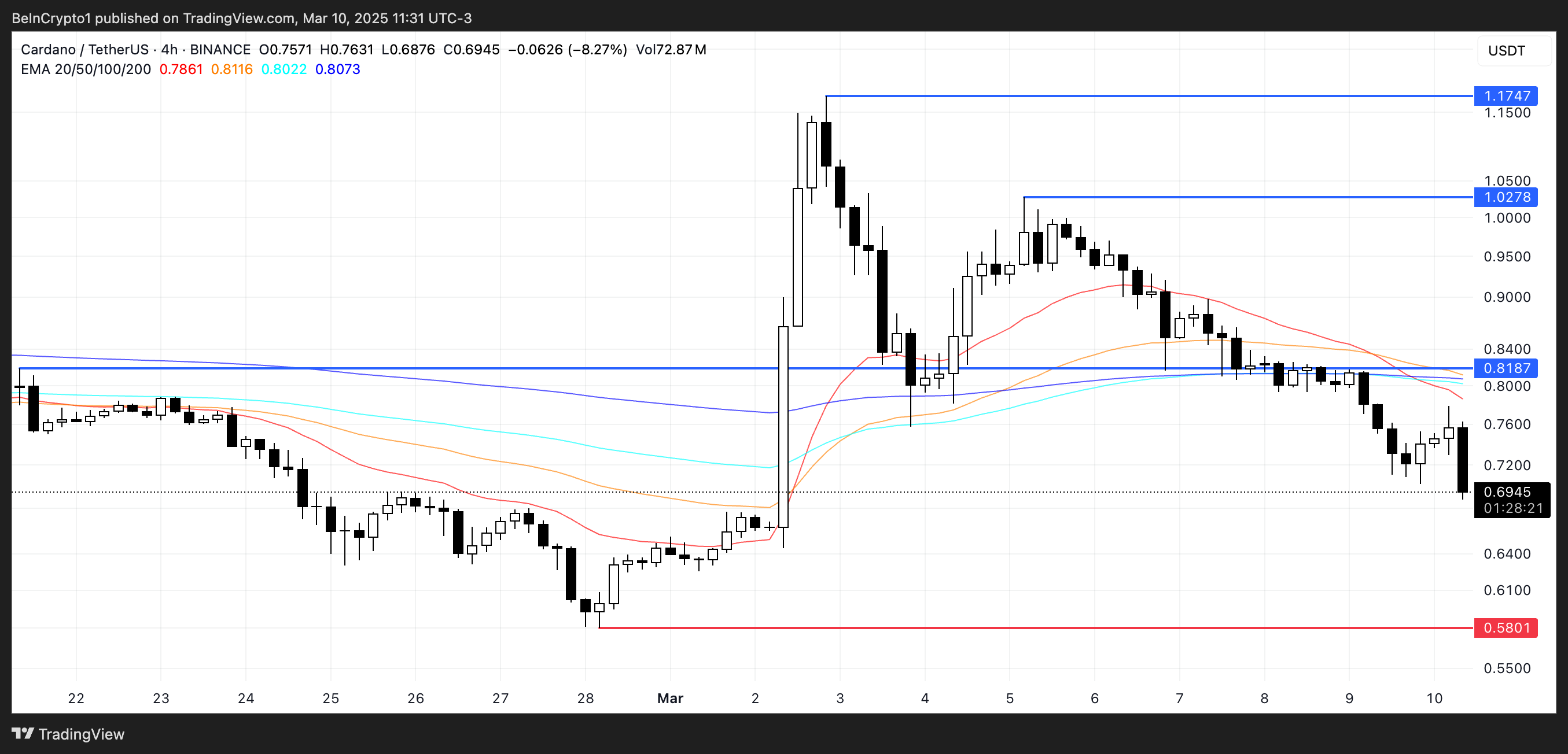 إذا حدث هذا التقاطع الهبوطي، قد ينخفض سعر ADA أكثر، مع أن مستوى الدعم $0,58 يصبح منطقة رئيسية للمراقبة. قد يؤدي الانهيار دون هذا المستوى إلى خسائر أعمق.