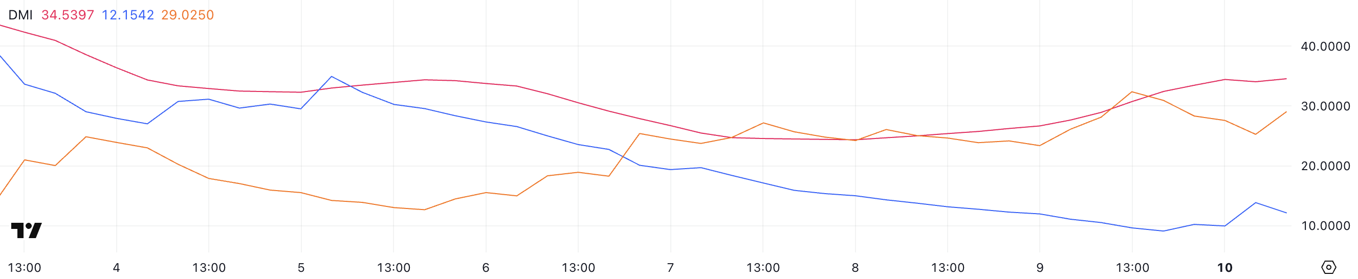 يظهر مخطط مؤشر الحركة الاتجاهية لكاردانو (DMI) أن مؤشر الاتجاه المتوسط (ADX) قد ارتفع إلى 34,5، مرتفعًا من 26,6 بالأمس. يشير هذا الارتفاع إلى أن الاتجاه الحالي لـ ADA - سواء كان صعوديًا أو هبوطيًا - يكتسب قوة.