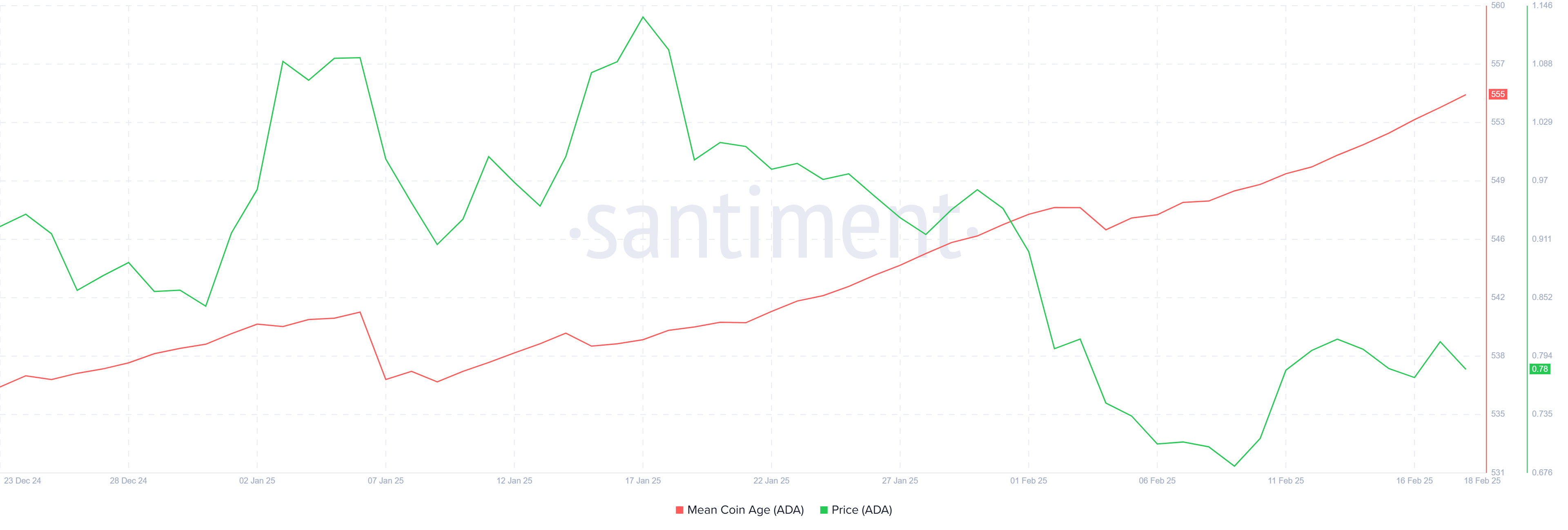 شهد مقياس متوسط عمر العملة مؤخرًا ارتفاعًا، مما يشير إلى أن حاملي المدى الطويل (LTHs) يحتفظون بـ ADA بدلاً من البيع. هذا الاتجاه حاسم لكاردانو، حيث يميل حاملو المدى الطويل إلى العمل كعمود فقري للأصل. ثقتهم في ADA تشير إلى توقعهم لارتفاع السعر في المستقبل، مما يعزز الإمكانات لانفجار السعر.