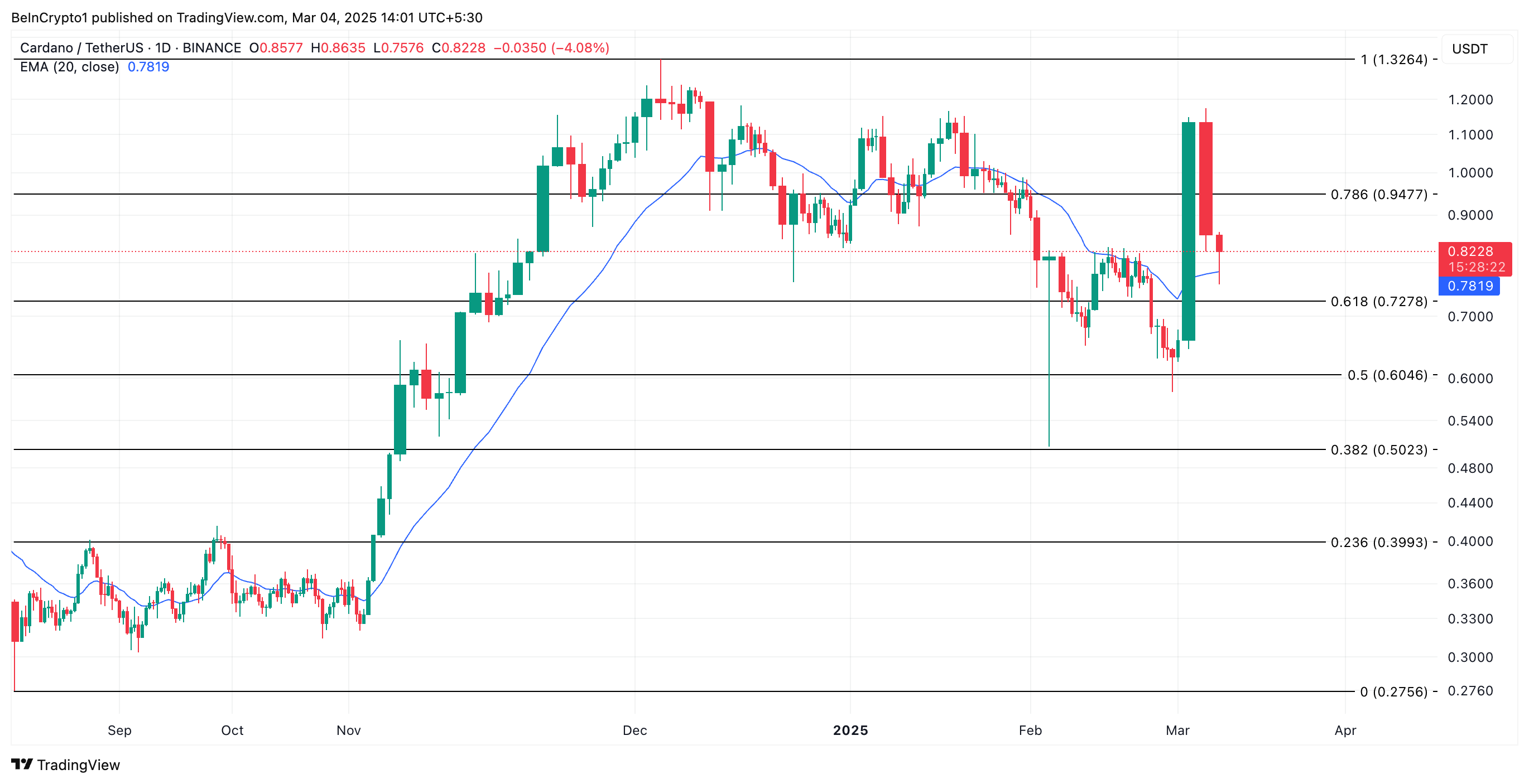 يتداول ADA عند $0,82 وقت النشر، مستقرًا فوق الدعم الذي تشكل عند $0,72. إذا زاد الضغط الهبوطي، فقد يفشل هذا المستوى من الدعم في الصمود. في هذه الحالة، قد ينخفض سعر ADA نحو $0,60.