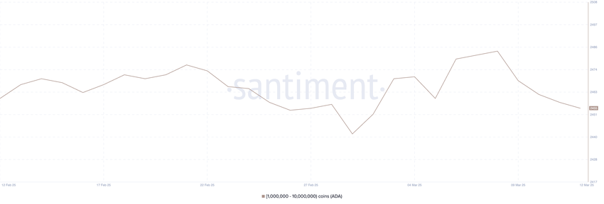 انخفض عدد عناوين حيتان كاردانو - التي تحتفظ بين 1 مليون و10 ملايين ADA - إلى 2,455، من 2,484 في 8 مارس.