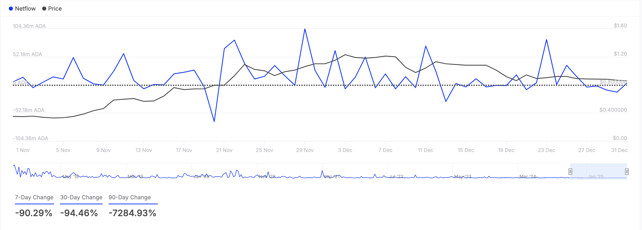 :وفقًا لـ IntoTheBlock، تدفق صافي حاملي كاردانو الكبار قد انخفض بنسبة 90% خلال الأيام السبعة الماضية. حاملو الكبار هم عناوين الحيتان التي تمتلك أكثر من 0,1% من العرض المتداول للأصل.