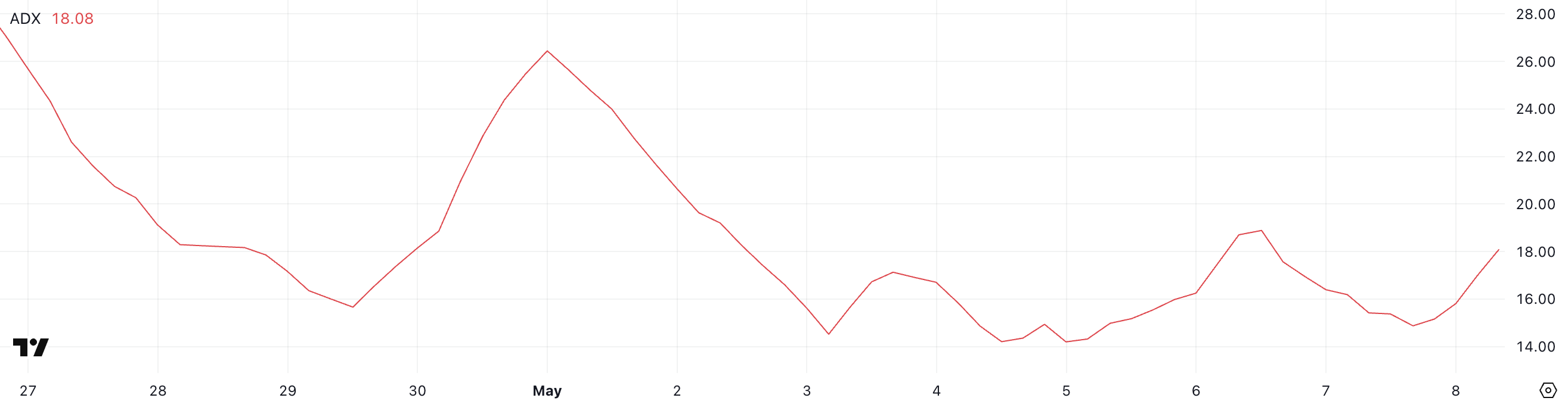 يعد ADX مؤشرًا فنيًا شائع الاستخدام يقيس قوة الاتجاه، ولكن ليس اتجاهه. تشير القراءات التي تقل عن 20 عادةً إلى سوق ضعيف أو متراوح، بينما تشير القيم بين 20 و25 إلى أن الاتجاه يتشكل.