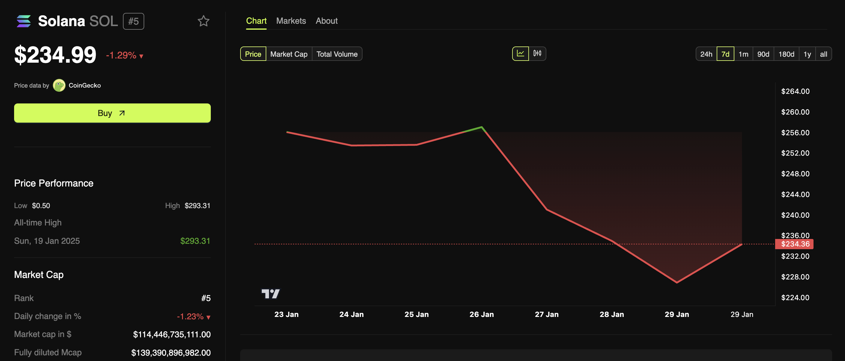 وقت كتابة هذا التقرير، تداول sol بسعر 234,99$، بانخفاض 1,29% خلال الـ24 ساعة الماضية. كان السوق الأوسع للعملات الرقمية يواجه أيضًا تراجعًا، مما ساهم في انخفاض السعر.