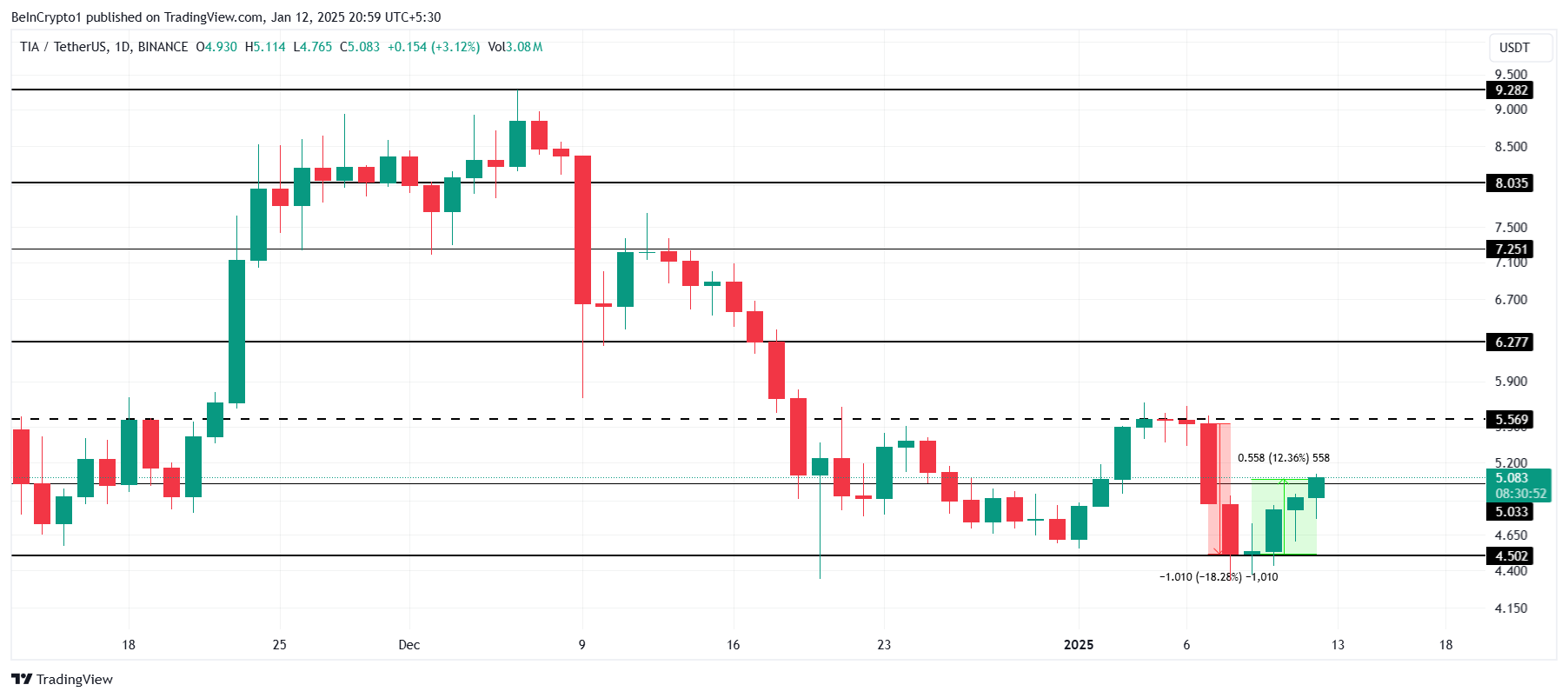 يثير هذا المقاومة مخاوف بشأن قدرة TIA على الحفاظ على الزخم الصعودي في المدى القصير.