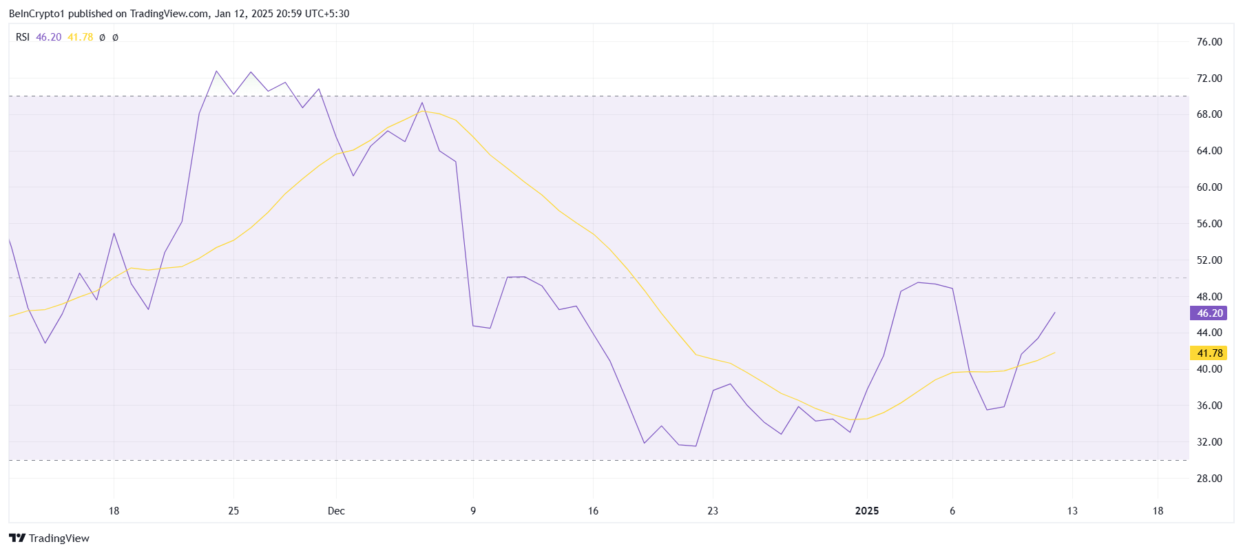 يكشف الزخم الكلي لـسيليستيا عن تحديات إضافية. ظل مؤشر القوة النسبية (RSI) تحت خط 50,0 المحايد خلال الشهر الماضي، مما يشير إلى ضعف الزخم الصعودي. رغم أن مؤشر القوة النسبية أظهر بعض التحسن مؤخرًا، إلا أن عدم قدرته على التحرك فوق المنطقة المحايدة يبرز الحالة الهشة لتعافي TIA.