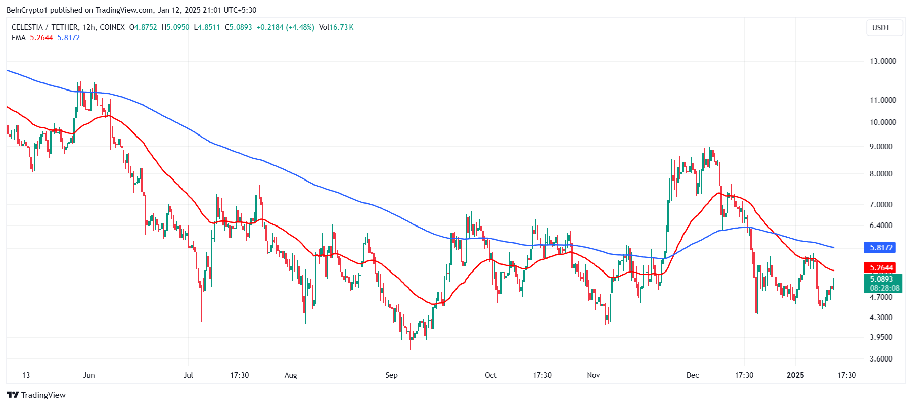 خلال الأيام الأربعة الماضية، حققت سيليستيا انتعاشًا بنسبة 12%. ومع ذلك، فإن هذا المكسب يعوض جزئيًا فقط التصحيح بنسبة 18% الذي حدث الأسبوع الماضي، مما يترك الأصل عرضة لمزيد من الضغوط السوقية. الانتعاش، رغم أنه واعد، لا يكفي لتأكيد انعكاس.
