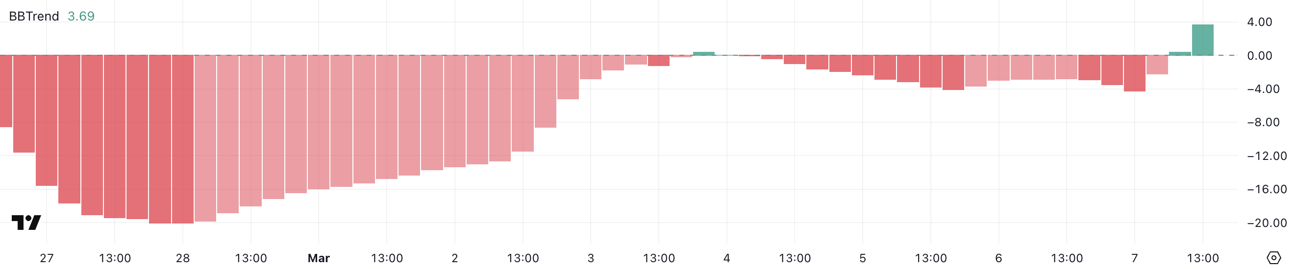 تحول BBTrend لتشين لينك الآن إلى إيجابي، حيث وصل إلى 3,69 بعد أن كان في المنطقة السلبية منذ 4 مارس. تم تسجيل قراءة سلبية بشكل كبير بلغت -20 في 28 فبراير.