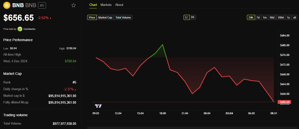 تُظهر بيانات BeInCrypto أن سعر BNB انخفض تقريبًا 3% في الـ24 ساعة الماضية. في وقت كتابة هذا التقرير، كان يتم تداوله بسعر $656,65.