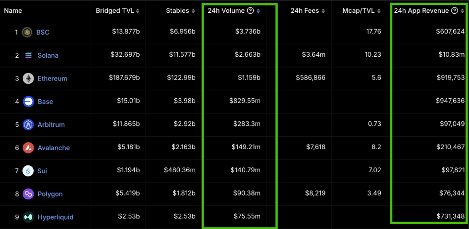 استعادت سولانا منذ ذلك الحين موقعها في القمة، مع قدوم سلسلة BNB في المركز الثالث بعد إيثريوم. تظهر أحدث البيانات على DefiLlama أن سولانا، إيثريوم، وBNB سجلت 2,94 مليار دولار، 2,24 مليار دولار، و2,15 مليار دولار، على التوالي.