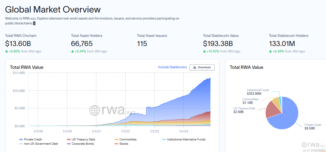 شهد سوق الأصول الحقيقية المرمزة نموًا سريعًا، حيث وصل إلى قيمة 13,6 مليار دولار حتى كتابة هذه السطور. يمثل هذا زيادة قدرها 3 مليارات دولار منذ أغسطس، مدفوعًا بالاهتمام المؤسسي والتقدم في بنية البلوكشين التحتية.