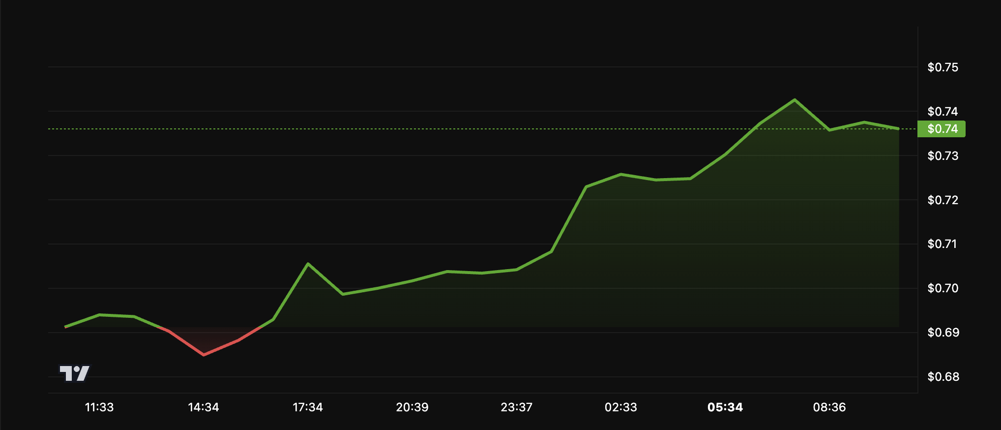 مثل ZORA، استفاد سعر MNT أيضًا من الأخبار. خلال اليوم الماضي، زادت قيمة الرمز بنسبة 6,5%. في وقت كتابة هذا التقرير، كان يتم تداوله عند $0,74.
