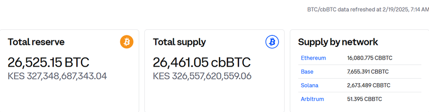 وفقًا لبيانات PoR، فإن بورصة كوينبيس تحتفظ بإجمالي احتياطي يبلغ 26525,15 BTC، مع عرض cbBTC المقابل لـ 26461,05 رمزًا.