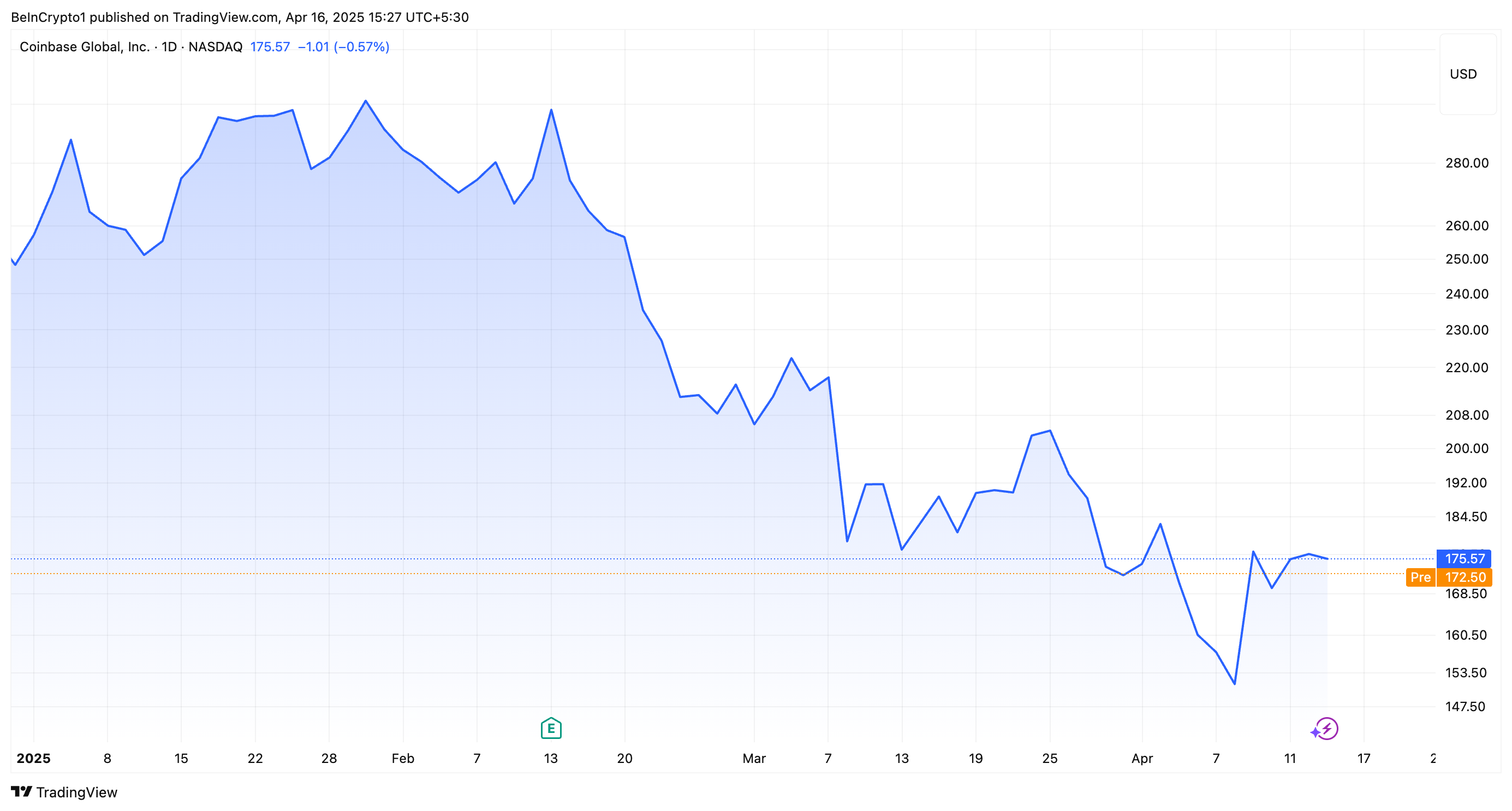 أظهرت البيانات الأخيرة أن COIN انخفض بنسبة ٠,٥٧٪ عند إغلاق السوق. بالإضافة إلى ذلك، في التداول قبل السوق، انخفض السهم أكثر بنسبة ١,٦١٪.
