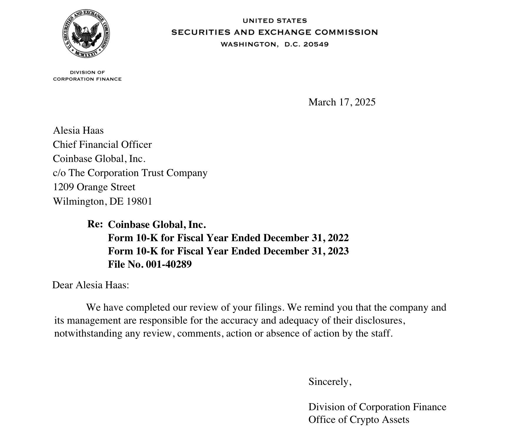 أكملت هيئة الأوراق المالية والبورصات الأمريكية (SEC) مراجعة شاملة للإفصاحات المالية لشركة كوين بيس. لم تطلب الهيئة التنظيمية من الشركة تعديل أو إعادة صياغة الوثائق ذات الصلة.