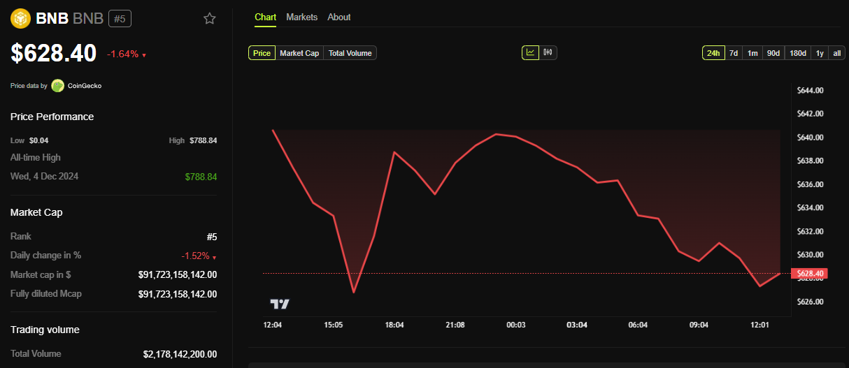 في الوقت نفسه، تُظهر بيانات BeInCrypto أن BNB كان يتداول بسعر 628,40$ في وقت كتابة هذا التقرير، بانخفاض يقارب 2% في آخر 24 ساعة. من المتوقع أيضًا أن يزيد الإدراج من السيولة والتقلبات لـBNB، خاصة حول تاريخ الإطلاق.