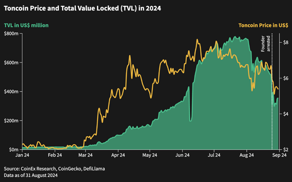 أدى اعتقال مؤسس تيليجرام ”بافل دوروف“ إلى انخفاض سعر التونكوين (Toncoin) وإجمالي القيمة المقفلة (TVL)، مما أدى إلى انخفاض سعر التونكوين بنسبة 20٪ وانخفاض إجمالي القيمة المقفلة (TVL) بنسبة 30٪. ومع ذلك، فقد احتشد المجتمع، وتبنى صورة رمزية لعُملة ”كلب المقاومة“ كرمز للدعم والمرونة.