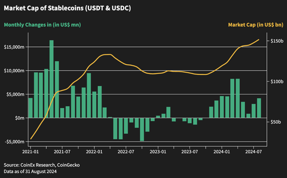 في أغسطس، تم إصدار 4 مليارات دولار أمريكي إضافية من عملات USDT و USDC، مما أعاد المستويات إلى تلك التي شوهدت في نوفمبر من العام الماضي. في الوقت الحالي، يمر السوق بفترة ركود بسبب نقص السيولة وروايات السوق. يشير التدفق القوي للعملات المستقرة إلى أن السوق لم تدخل مرحلة السوق الهابطة المطلقة على غرار أوائل عام 2022 عندما بدأت العملات المستقرة في التدفق إلى الخارج.