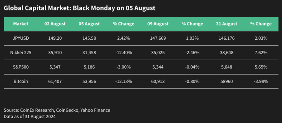 أدى قرار بنك اليابان المركزي بزيادة أسعار الفائدة إلى اضطراب كبير في السوق، مما أدى إلى عمليات بيع عالمية خلال الأسبوع الذي بدأ في 4 أغسطس. وفي حين انتعشت أسواق الأسهم الأمريكية سريعًا من خسائرها، فشلت سوق العملات المشفرة في عكس هذا الانتعاش. أظهرت البيتكوين في البداية انتعاشًا تدريجيًا، ووصلت إلى مستويات افتتاح شهر أغسطس، ولكنها تراجعت بعد ذلك لتغلق الشهر بالقرب من مستوى 58,000 دولار. وانخفضت أرصدة البيتكوين في البورصات إلى أدنى مستوى لها في عام 2024 عند 2.39 مليون بيتكوين، مما يشير إلى تزايد ميل المستثمرين إلى الاحتفاظ بالبيتكوين بدلاً من تصفية المراكز.