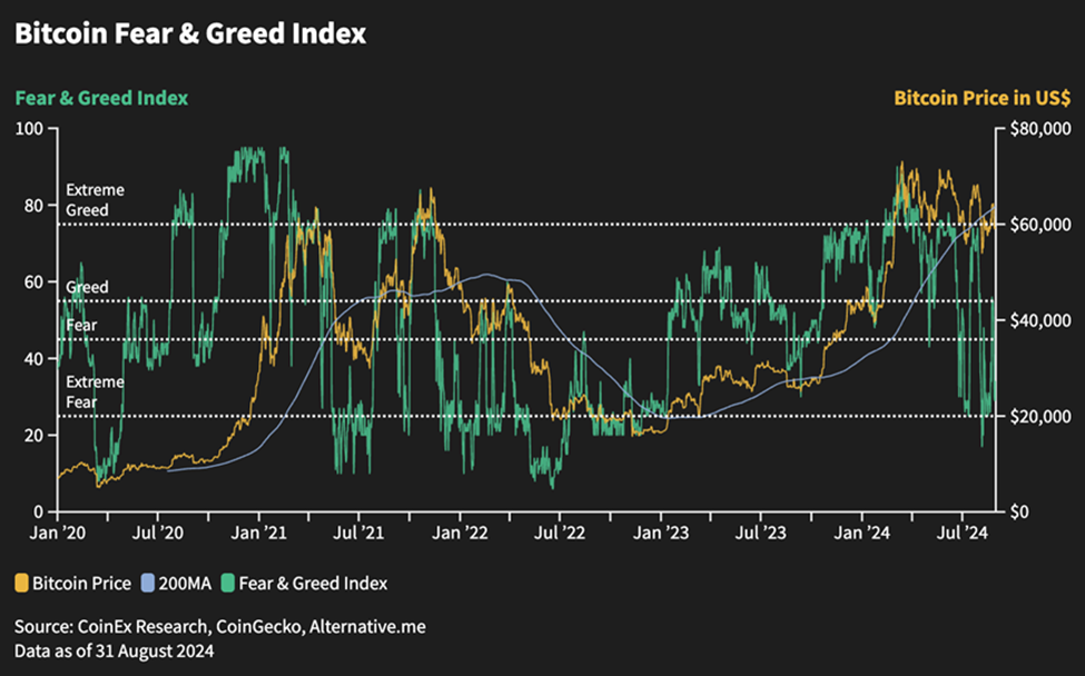 السوق في حالة من عدم اليقين، حيث يفتقر إلى اتجاه واضح، مع انزلاق مؤشر الخوف والجشع إلى منطقة ”الخوف الشديد“. يُنظر إلى خفض سعر الفائدة من قبل الاحتياطي الفيدرالي في سبتمبر على نطاق واسع على أنه إجماع في السوق ويبدو أنه تم تسعيره إلى حد كبير. وقد يُمثل ذلك فرصة شراء للمستثمرين على المدى الطويل الراغبين في تجاوز التقلبات.