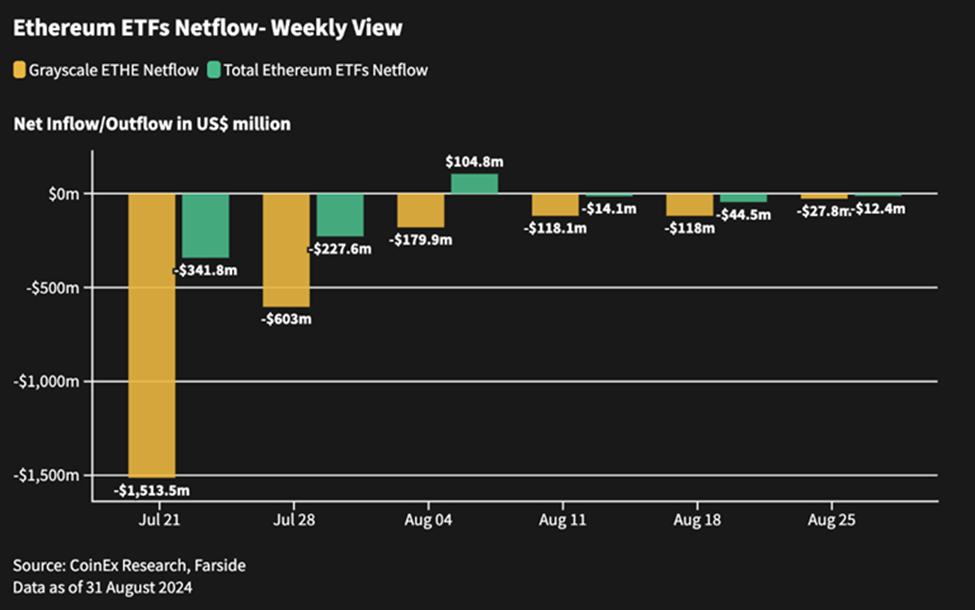 شهدت صناديق الإيثريوم المتداولة في الإيثريوم تدفقًا صافيًا إيجابيًا في شهر أغسطس، حيث سجلت صافي تدفق للداخل بقيمة 6.2 مليون دولار، مقارنةً بصافي تدفق كبير للخارج بقيمة 541.8 مليون دولار في شهر يوليو. وعلى الرغم من التدفق الصافي الصغير إلى صناديق الإيثريوم المتداولة في البورصة، إلا أن سعر الإيثريوم لا يزال يواجه ضغوطًا هبوطية. ويحدث ذلك حتى مع تباطؤ التدفقات الخارجة من صناديق ETHE الخاصة بـ Grayscale، مما يشير إلى التحديات المستمرة التي تواجه الإيثيريوم في الحفاظ على استقرار السعر. ولكن تظل مقترحات القيمة الأساسية للإيثيريوم، لا سيما في قطاع DeFi، قوية ومستدامة.