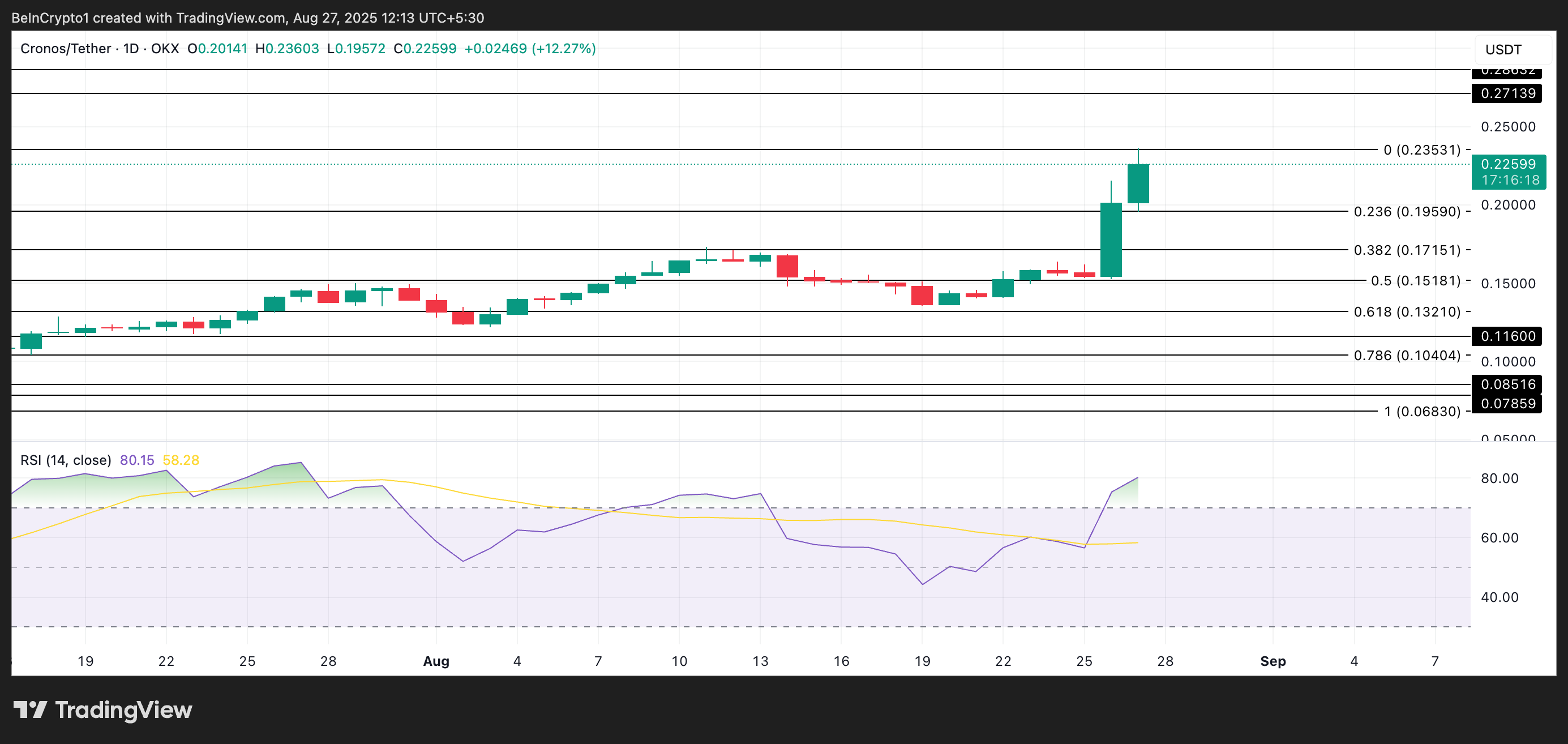 تظهر قراءات مؤشر القوة النسبية (RSI) لـ CRO على الرسم البياني اليومي أن العملة البديلة قد دخلت منطقة الشراء المفرط، وهو مؤشر كلاسيكي على أنها قد تكون على وشك الانخفاض. في وقت النشر، يقف هذا المؤشر عند 80,77.