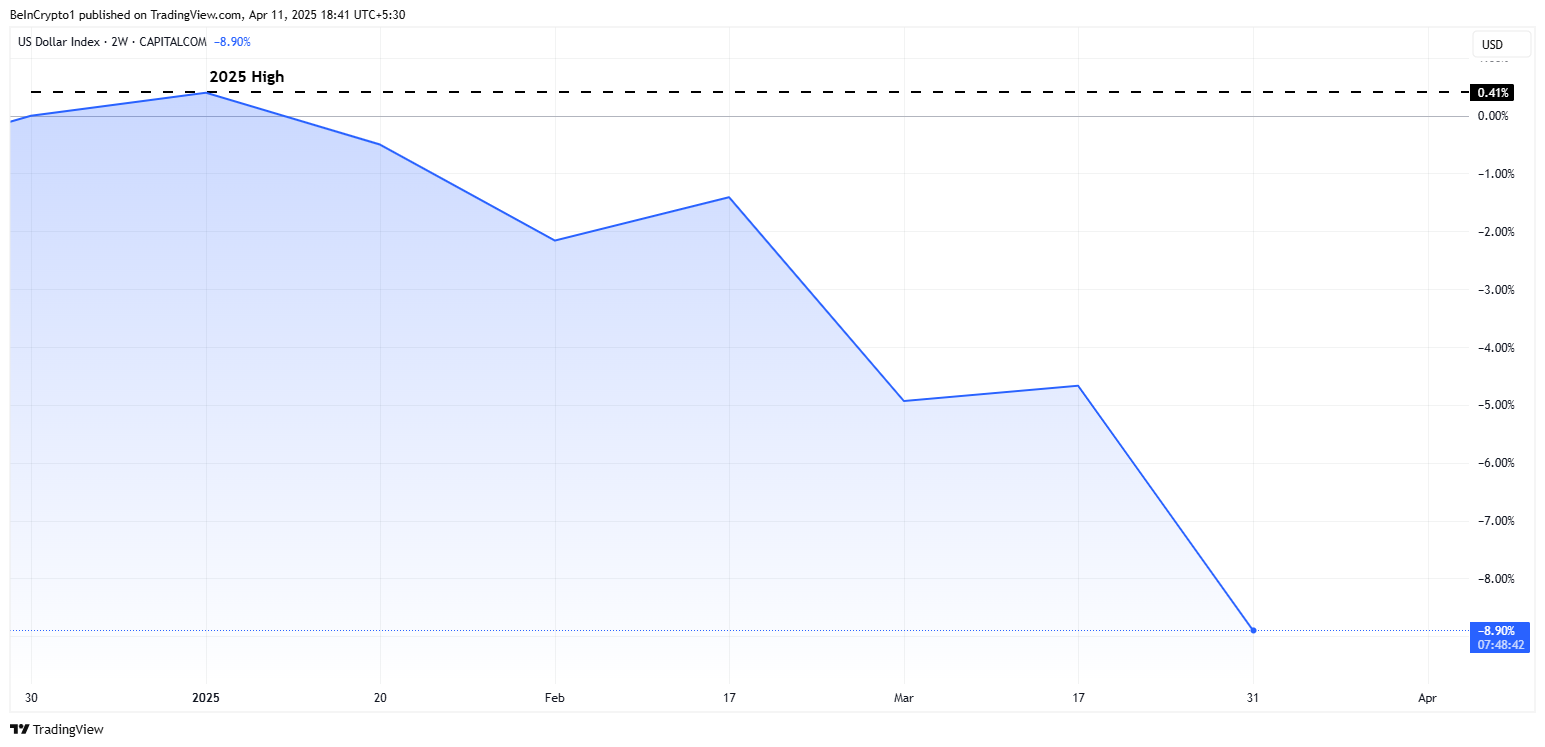 البيانات على TradingView تظهر أن DXY انخفض بنسبة تقارب 10% منذ بداية العام (YTD)، من أعلى مستوى خلال اليوم في 13 يناير عند $109,87 إلى $99,04 حتى كتابة هذه السطور.