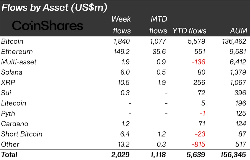 ومع ذلك، كان بيتكوين المستفيد الرئيسي الأسبوع الماضي. حيث سجل تدفقات تصل إلى ١,٨ مليار دولار. وبالمثل، شهدت إيثريوم الأسبوع الثاني من التدفقات القوية التي بلغت ١٤٩ مليون دولار. في الوقت نفسه، شهدت العملات الأخرى مثل سولانا تدفقات طفيفة بلغت ٦ ملايين دولار.