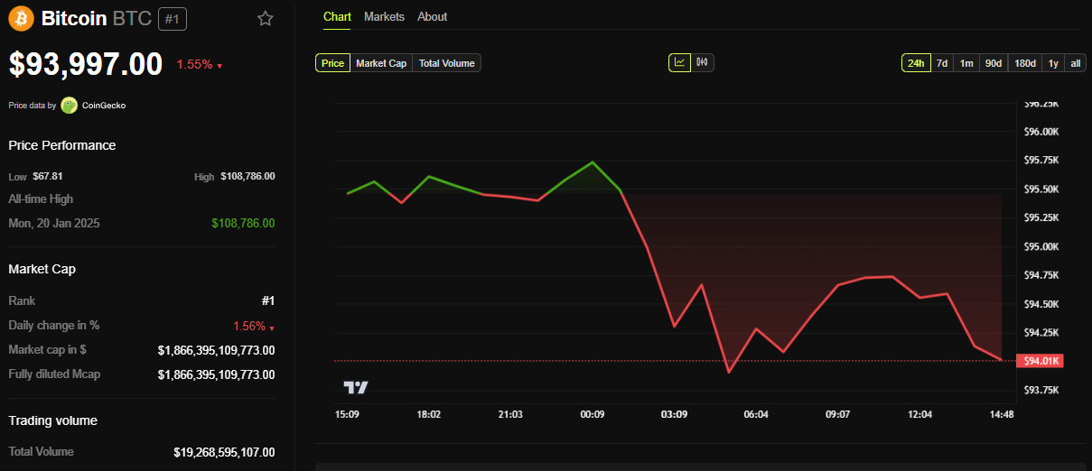 تظهر بيانات BeInCrypto أن BTC كان يتداول بسعر 93,997 دولارًا أمريكيًا في وقت كتابة هذا التقرير. كان منخفضًا بنسبة تقارب 2% في الـ 24 ساعة الماضية، بعد أن انخفض إلى ما دون نطاق 94,000 دولار يوم الاثنين.