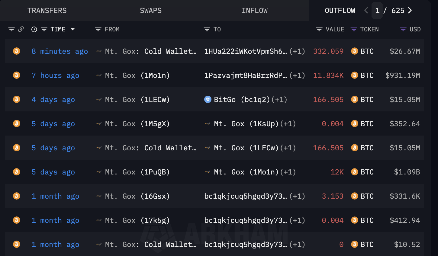 بعد بضع ساعات من ذلك، قامت محفظة Mt. Gox الباردة مرة أخرى بنقل 332 BTC بقيمة 26,6 مليون دولار إلى عنوان آخر. جاءت هذه التحويلات بعد وقت قصير من تحركها السابق لـ12,000 BTC بقيمة 1 مليار دولار في ذلك الوقت.