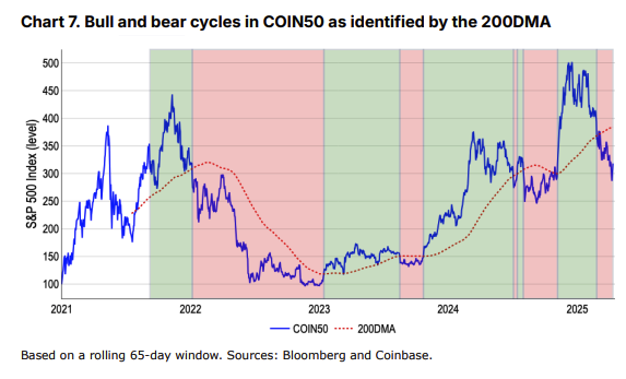 تمت ملاحظة أن كل من بيتكوين (BTC) ومؤشر COIN50 قد انخفضا مؤخرًا إلى ما دون متوسط الحركة لـ200 يوم (200DMA)، مما يشير إلى إمكانية بدء دورة سوق هابطة. يتتبع مؤشر Coinbase 50 أو COIN50 أداء أكبر 50 أصل رقمي وأكثرها سيولة من حيث القيمة السوقية.