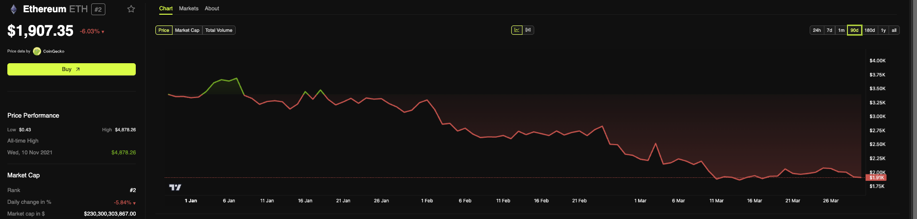 "تحاول إيثريوم العمل كأصل نقدي، حيث تكافح للتنافس مع بيتكوين، وكمنصة عقود ذكية، حيث تواجه منافسة قوية من سولانا"، صرح محلل كوينشيرز.