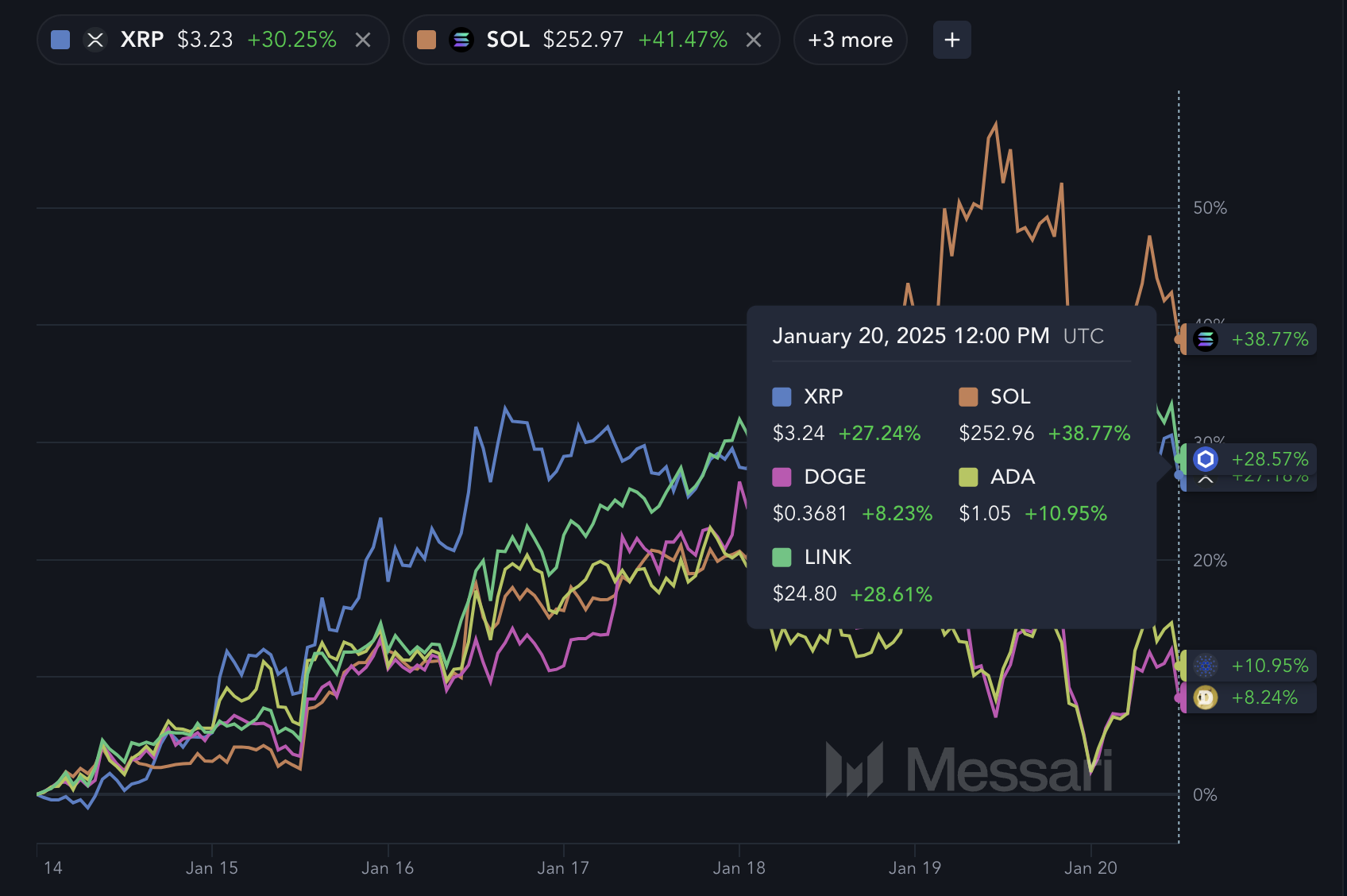 أثار إطلاق العملة الرسمية لدونالد ترامب موجة من الاهتمام بالعملات الميم السياسية، مع اكتساب رموز جديدة مثل MELANIA بسرعة. أخيرًا، تشهد العملات "صنع في الولايات المتحدة"، مثل SOL وXRP وDOGE، ارتفاعًا مع تزايد التفاؤل بشأن إمكانية ازدهار المشاريع القائمة في الولايات المتحدة تحت سياسات أكثر ملاءمة.