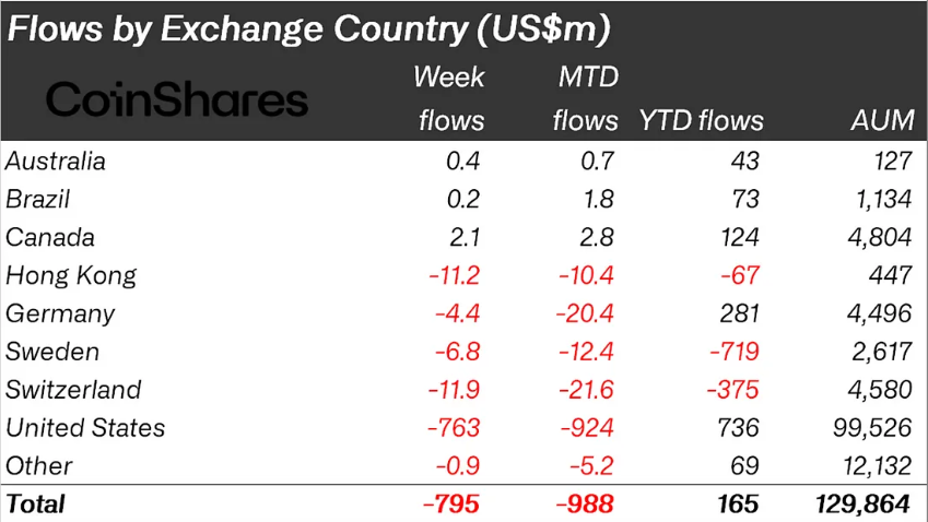 وفقًا لأحدث أبحاث CoinShares، بلغت تدفقات العملات المشفرة الخارجة ٧٩٥ مليون دولار الأسبوع الماضي. يمثل هذا الأسبوع الثالث على التوالي من التدفقات السلبية، حيث يستمر عدم اليقين المالي في التأثير بشكل كبير على معنويات المستثمرين.