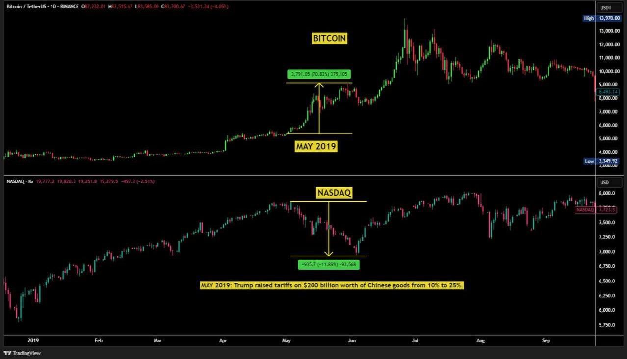 في منشور X منشور، قام المحلل الرقمي أش كريبتو بفحص أداء بيتكوين التاريخي خلال حروب التجارة السابقة بين الولايات المتحدة والصين. بالنظر إلى مايو 2019، لاحظ أش أنه بعد أن فرض ترامب تعريفات على الصين وردت الأخيرة، تراجعت الأسهم بينما ارتفعت قيمة بيتكوين.