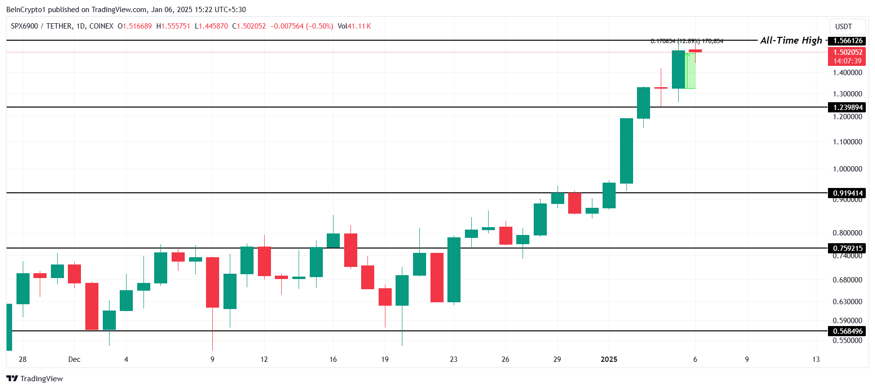حقق SPX أعلى مستوى له على الإطلاق عند $1,56 اليوم، مما يمثل إنجازًا كبيرًا. ومع ذلك، انخفض قليلاً ليتداول عند $1,50 بعد ارتفاع مثير للإعجاب بنسبة 16% خلال الـ24 ساعة الماضية، مما يظهر زخمًا قويًا في حركة سعر العملة البديلة.