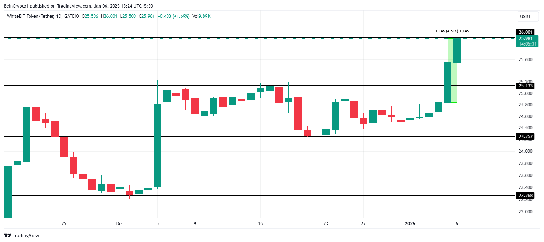 ارتفع سعر WBT بنسبة 4,6% في الـ 24 ساعة الماضية، ليصل إلى مستوى قياسي جديد قدره $26,0 خلال التداول اليومي اليوم. يبرز هذا النمو تجدد اهتمام المستثمرين ووجود اتجاه صعودي قوي للعملة البديلة.