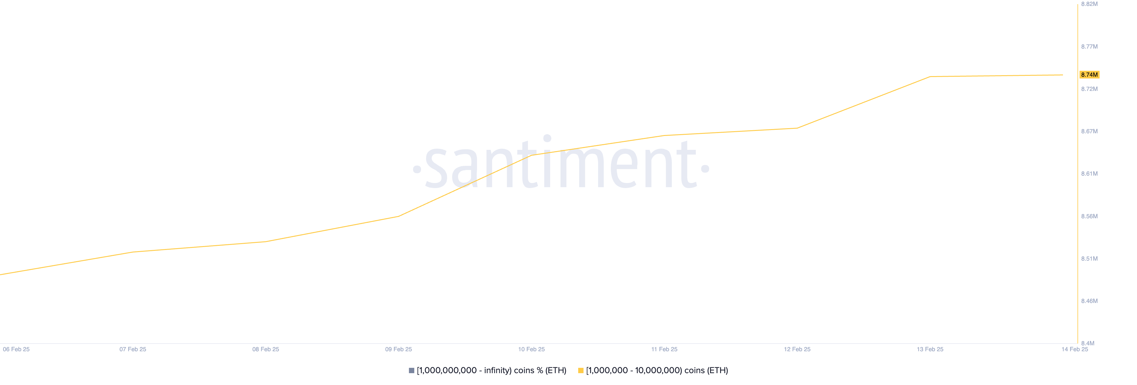 في وقت النشر، تمتلك هذه المجموعة من حيتان ETH 8,74 مليون عملة، وهو أعلى مستوى لها منذ 23 يناير.