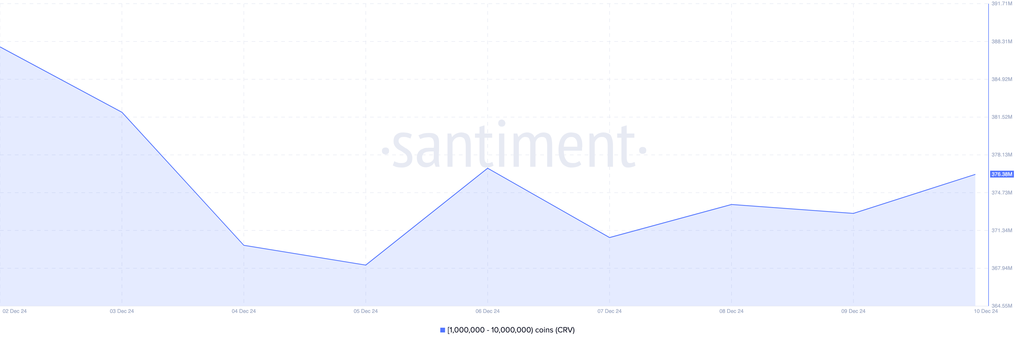 في 5 ديسمبر، كان رصيد هذه العناوين 368,24 مليون. اليوم زاد ذلك إلى 376,38 مليون. إذا استمر ذلك، قد يستمر سعر CRV في الارتفاع.