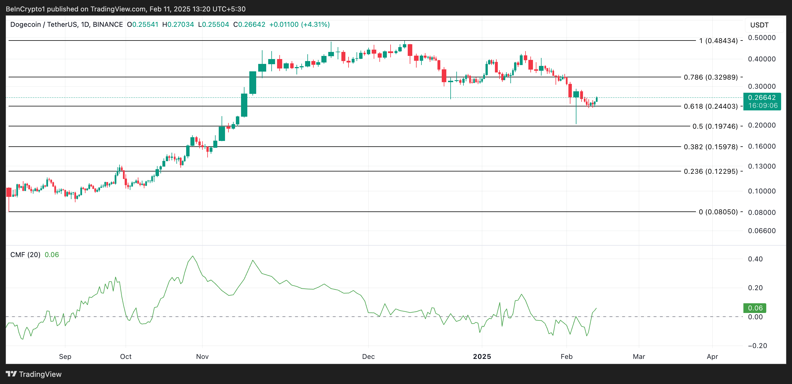 يقيس CMF للأصل تدفق الأموال إلى السوق وخارجه. يشير قيمة CMF الإيجابية مثل هذه إلى ضغط شراء قوي، مما يشير إلى أن دوجي يتم تجميعه بدلاً من بيعه. إذا استمر ضغط الشراء، فقد يدفع سعر العملة الميم إلى 0,32$.